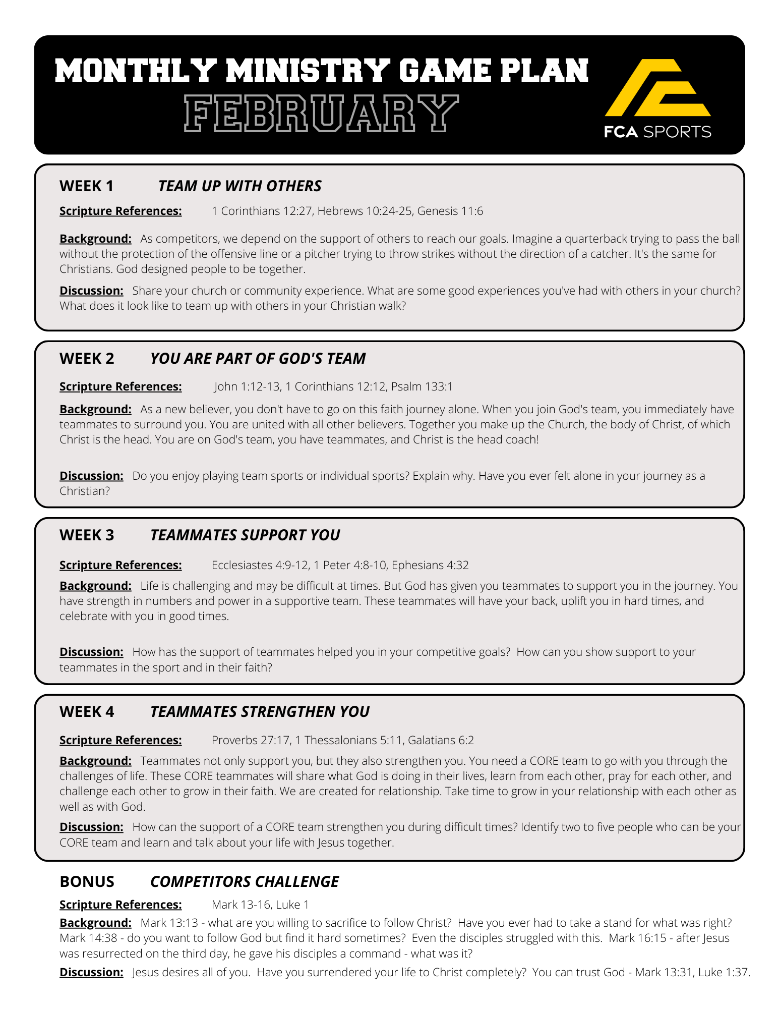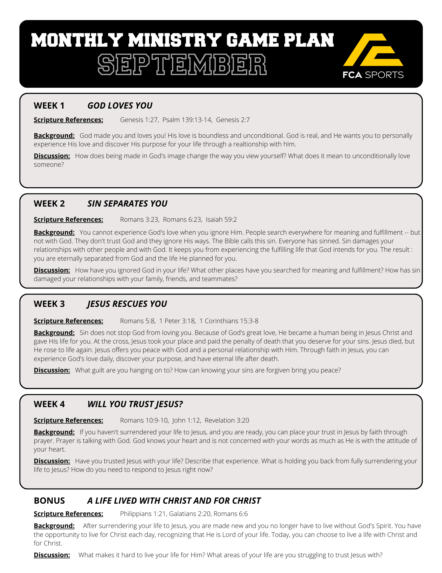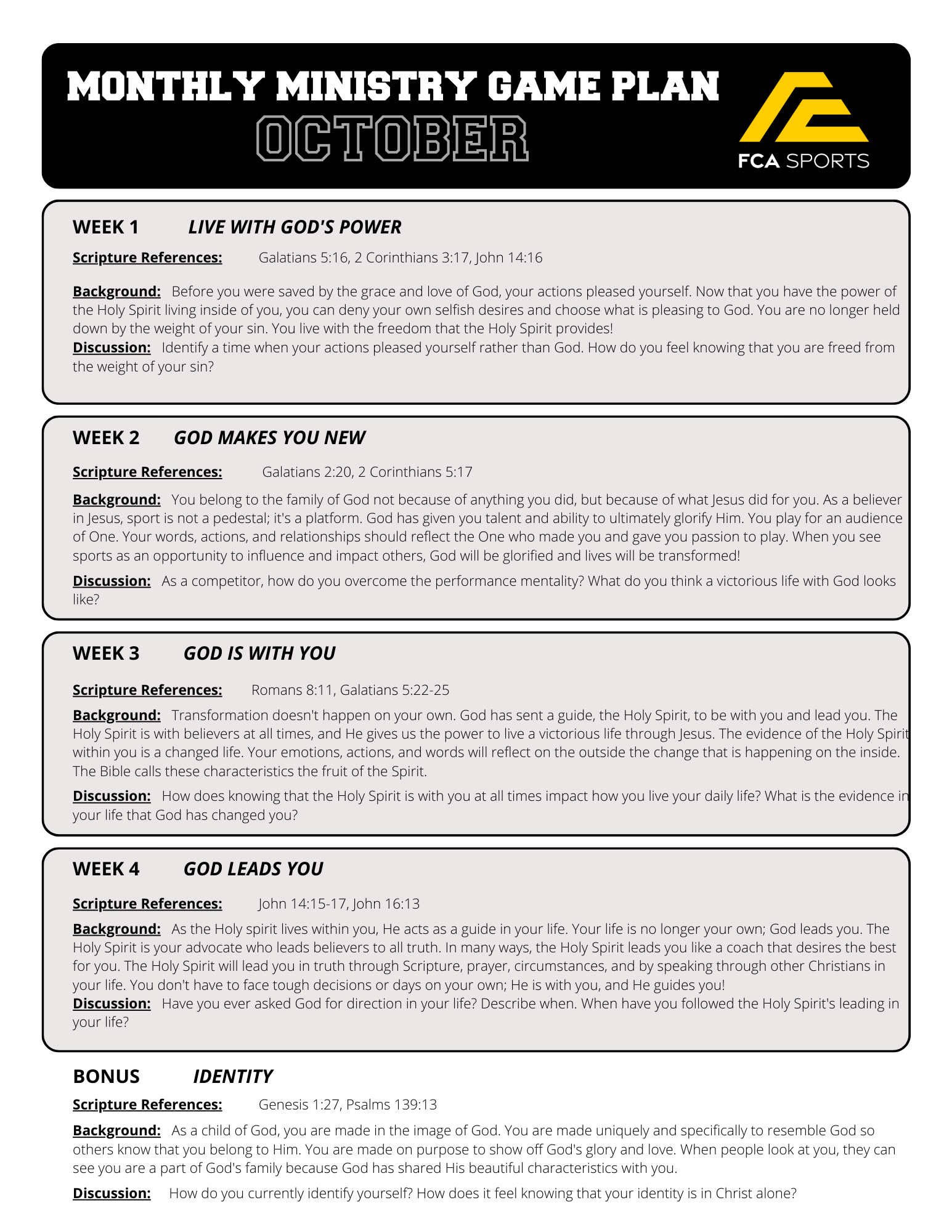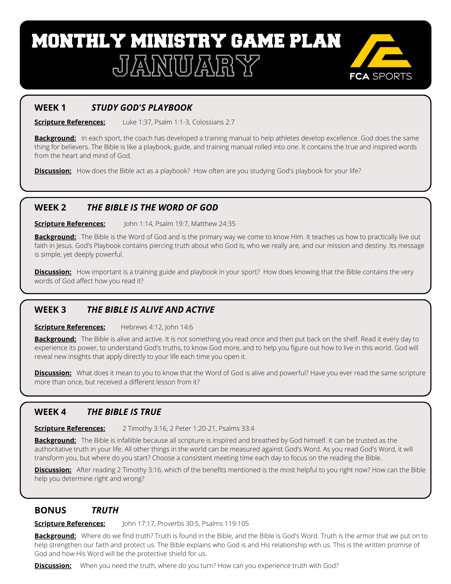 FCA Discovery Bible Study Monthly Game Plans are designed to help athletes and coaches dive deeper into God’s Word with clarity and purpose. Each month provides a simple, powerful path to grow in faith, build community, and live out the Gospel on and off the field. Jump in and discover what God can do through intentional time in Scripture.