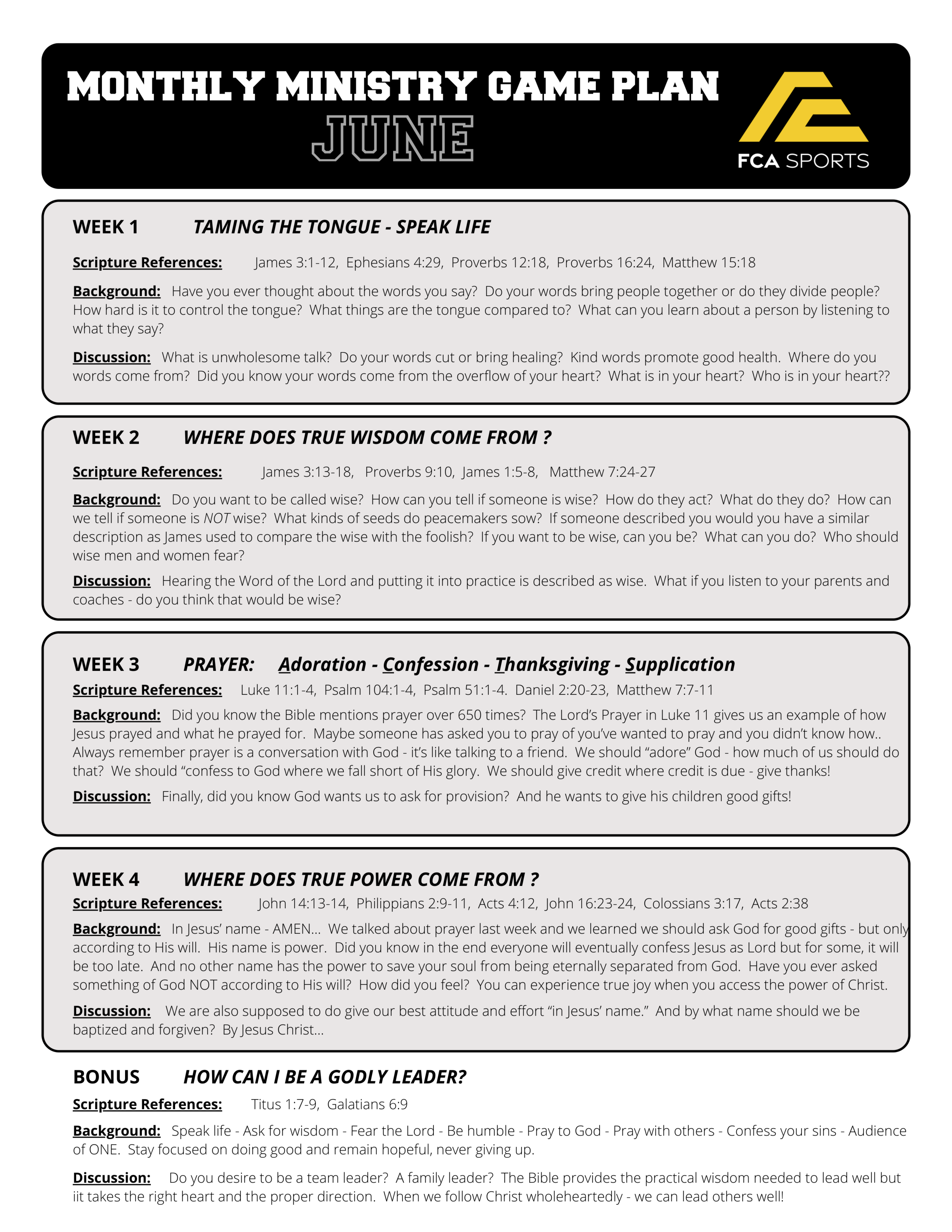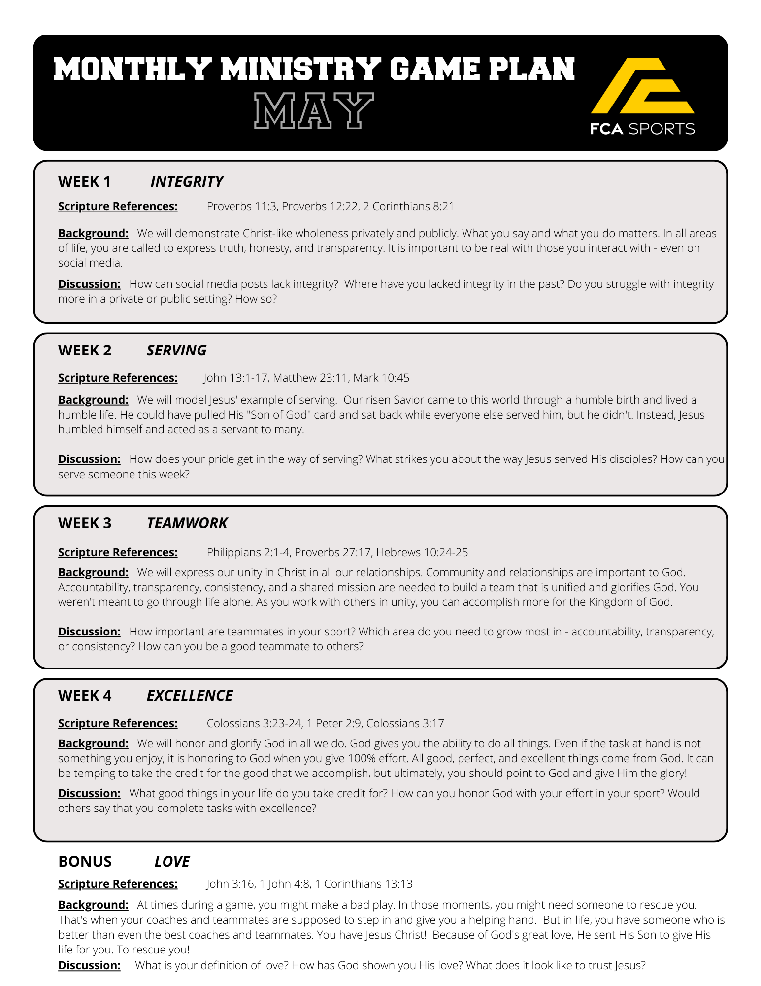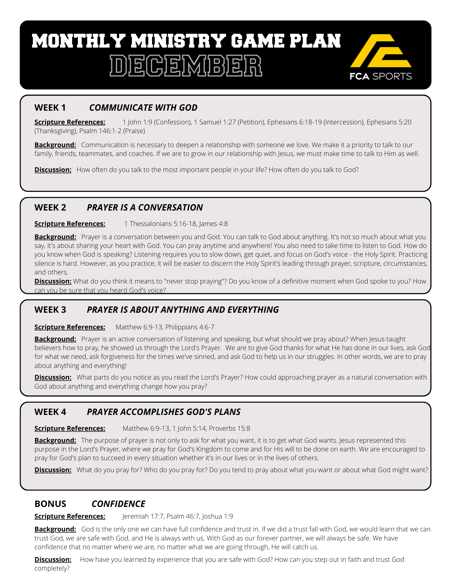 FCA Discovery Bible Study Monthly Game Plans are designed to help athletes and coaches dive deeper into God’s Word with clarity and purpose. Each month provides a simple, powerful path to grow in faith, build community, and live out the Gospel on and off the field. Jump in and discover what God can do through intentional time in Scripture.