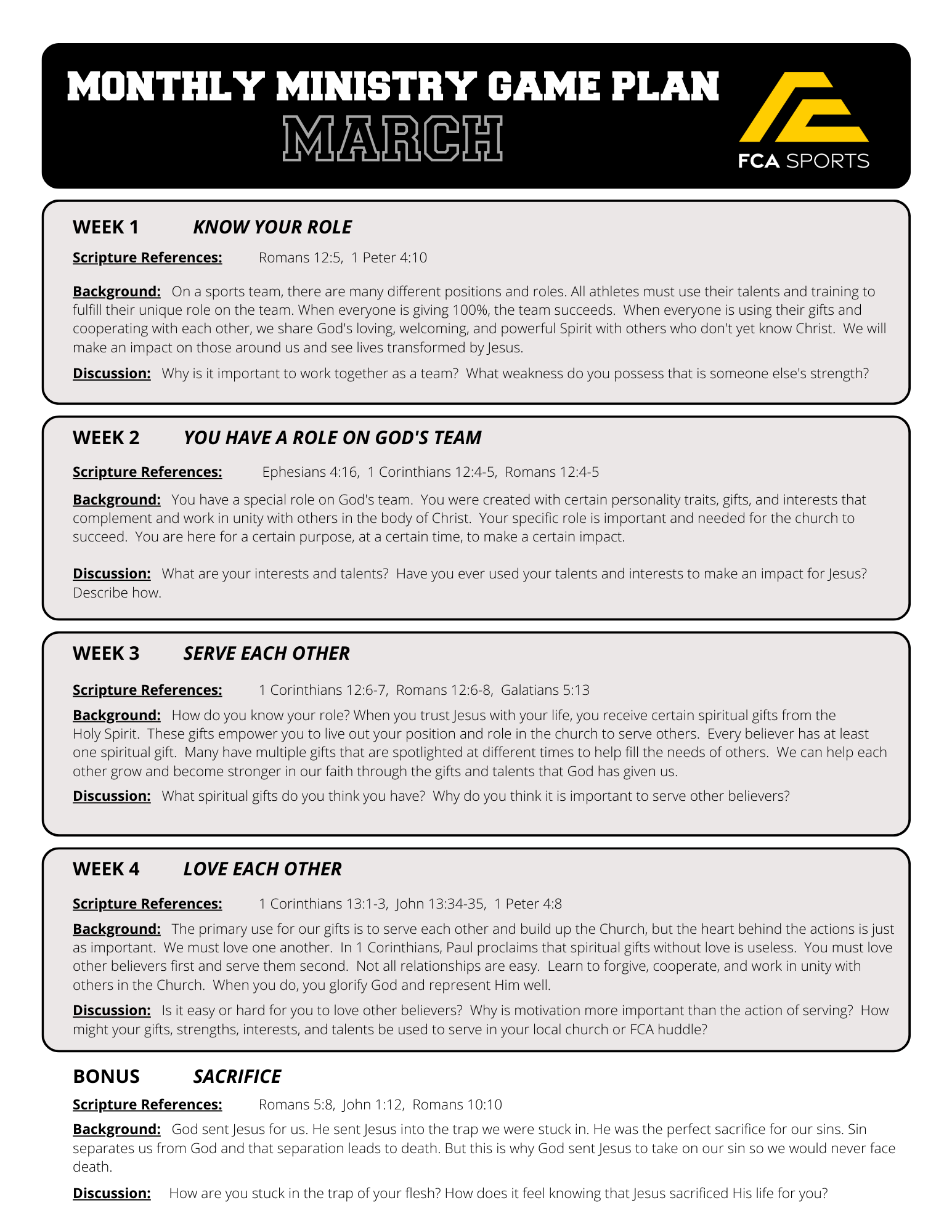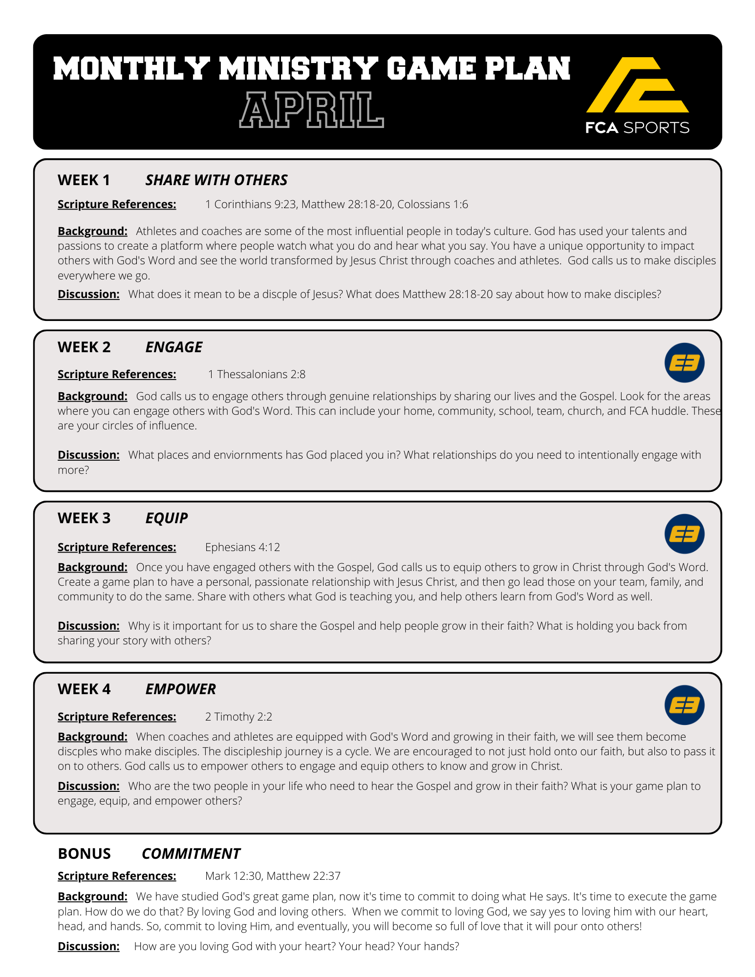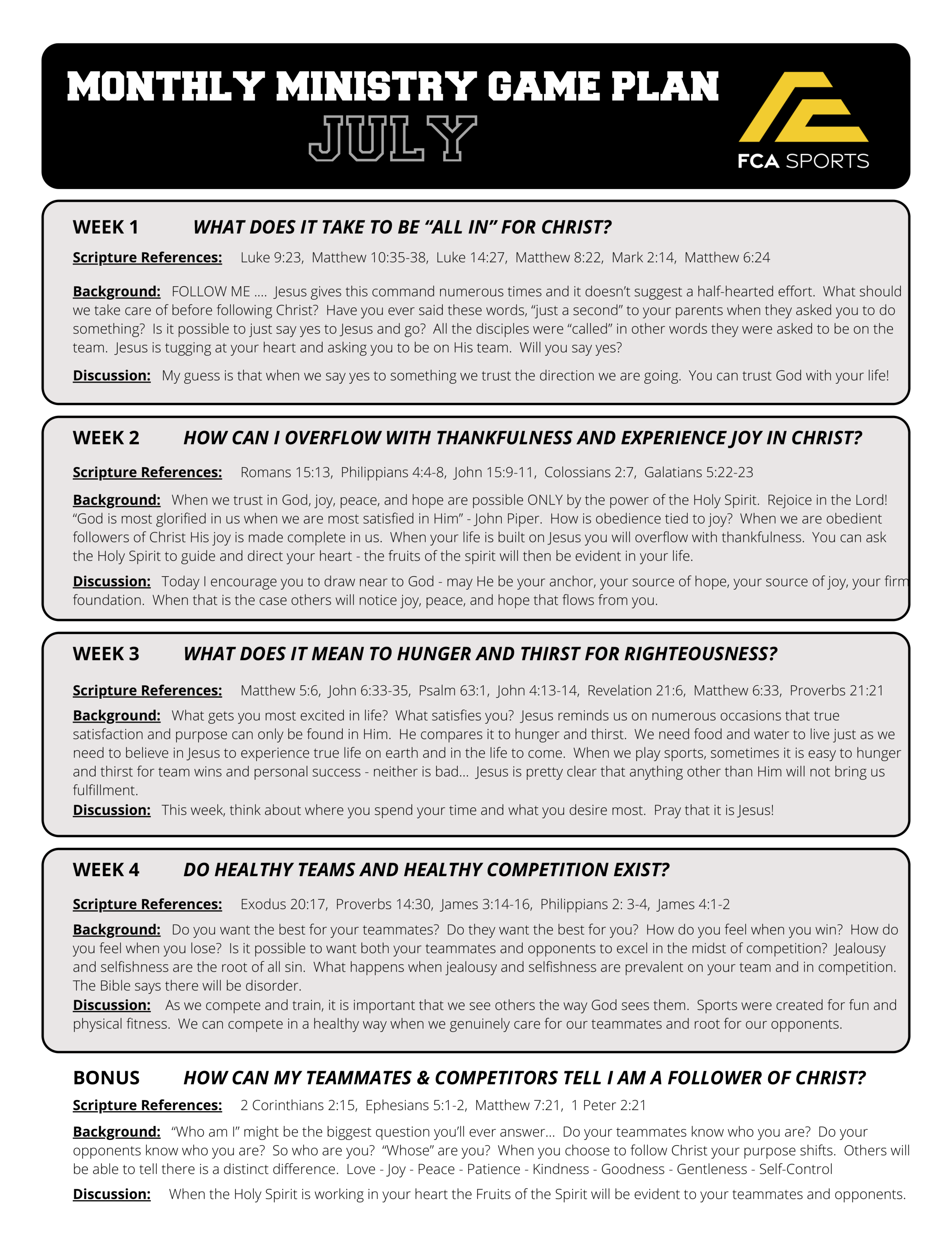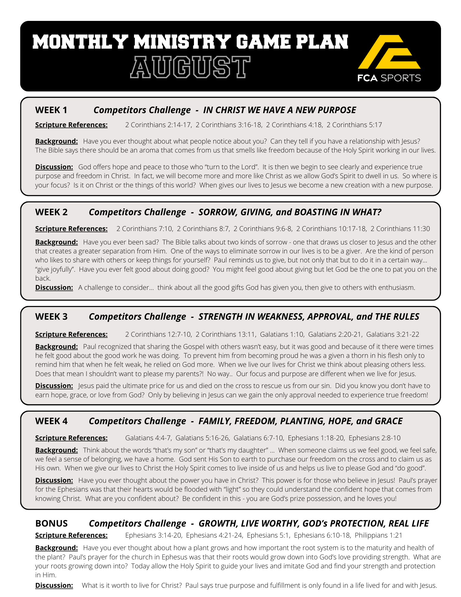 FCA Discovery Bible Study Monthly Game Plans are designed to help athletes and coaches dive deeper into God’s Word with clarity and purpose. Each month provides a simple, powerful path to grow in faith, build community, and live out the Gospel on and off the field. Jump in and discover what God can do through intentional time in Scripture.